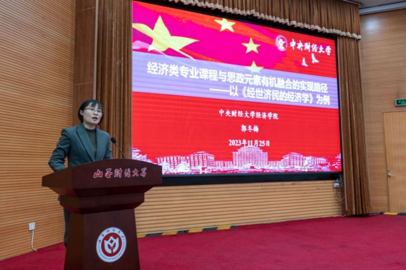 郭冬梅教授作题为“经济类专业课程与思政元素有机融合的实现路径——以《经世济民的经济学》为例”的报告,主要介绍了《经世济民的经济学》课程基本信息,以及专业课程与思政元素如何进行有机融合并给出了具体做法。郭教授指出,教师思政工作是难题,因此,引导教师积极投入课程思政的教学和研究是实现二者有机融合的关键。