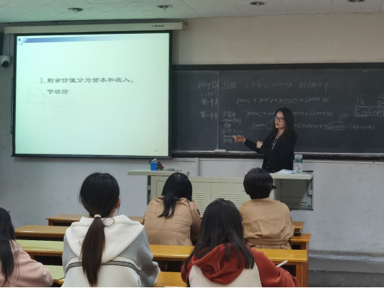 冯晓棠老师带领同学们共同研读了《资本论》第一卷第七篇第二十二章“剩余价值转化为资本”的内容。在梳理清楚本章内容与前面内容的逻辑关系后,冯晓棠老师先是通过板书将原著中几种再生产模型使用具体数据进行了过程推导和比较,包括简单再生产模型、剩余价值全部用于积累的再生产模型、剩余价值分比例用于消费和积累的再生产模型。进而说明当资本家用不同比例的剩余价值用于积累时再生产规模的不同,使得资本家更愿意用更大比例的剩余价值用于积累。因此“资本家是否是以牺牲自己的消费为代价即所谓节欲来实现资本主义扩大再生产?”冯晓棠老师通过抛砖引玉式地提问,让同学们思考并认清资本家节欲的本质,并激发同学们结合身边事物研读《资本论》经典的兴趣。最后,冯晓棠老师还和同学们一起结合原著的一些精彩表述,进一步理解积累量的几个决定因素。